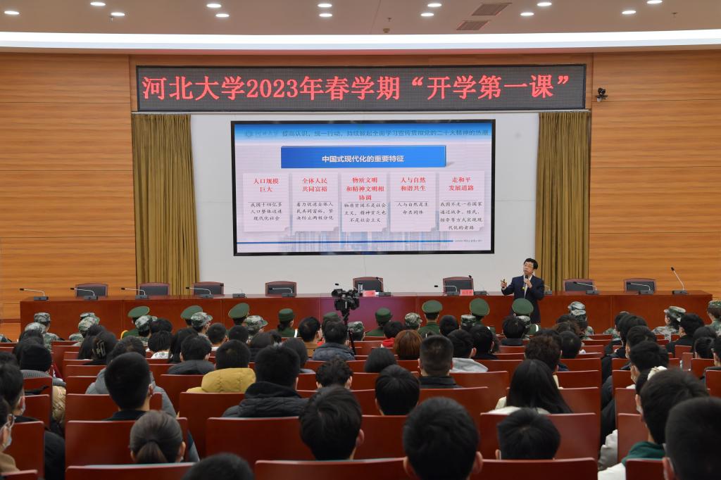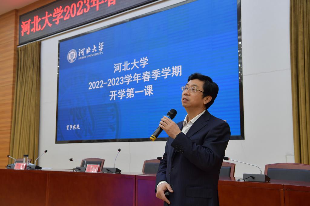 郭健從提高認識,統一行動,持續掀起全面學習宣傳貫徹黨的二十大精神的熱潮;堅定信心,乘勢而上,奮力譜寫學校事業高質量發展的新篇章;不負韶華,奮發進取,為推進中國式現代化場景貢獻青春力量三個大方面與學生們進行了交流。他深情叮囑同學們一定要持續加大對黨的二十大精神的學習宣傳力度,創新形式,豐富內容,不斷興起學習宣傳熱潮,扎實推動黨的二十大作出的重大決策部署在學校走深走實、落地見效;要胸懷“國之大者”,堅定正確的政治方向,堅定聽黨話、跟黨走的人生追求,懷抱夢想又腳踏實地,敢想敢為又善作善成,努力使自己成為祖國建設的有用之才、棟梁之才。郭健指出,今年是全面貫徹落實黨的二十大精神的開局之年,是實施“十四五”規劃承上啟下的關鍵一年,是加快學?!半p一流”建設的重要一年。全校上下要按照“1236”基本工作思路,發揮“部省合建”平臺優勢,解放思想、開拓創新,擼起袖子加油干、風雨無阻向前行,奮力推動學校事業實現高質量發展,為服務經濟強省、美麗河北作出新的更大貢獻。他向同學們提出三點期望:一要志存高遠,胸懷天下;二要不負華年,增長本領;三要強身健體,奮發進取。努力做到今天腳踏實地,為中國夢的“河大篇章”增光添彩;明天擔負使命,為全力描繪中國式現代化場景綻放青春和夢想!