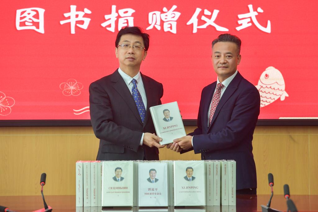 郭健代表學校向北京崇學文化的慷慨捐贈表示感謝。他指出,《習近平談治國理政》多語種圖書是系統反映習近平新時代中國特色社會主義思想的權威著作,展現了馬克思主義中國化時代化的最新成果。此次受贈系列圖書,進一步豐富了學校圖書館館藏文獻資源,必將成為廣大師生深入學習黨的創新理論的重要教材。余富文在發言中希望捐贈圖書能助力河北大學深入學習貫徹習近平新時代中國特色社會主義思想,不斷提升政治工作和教學科研工作水平,共同攜手對外講好中國故事。