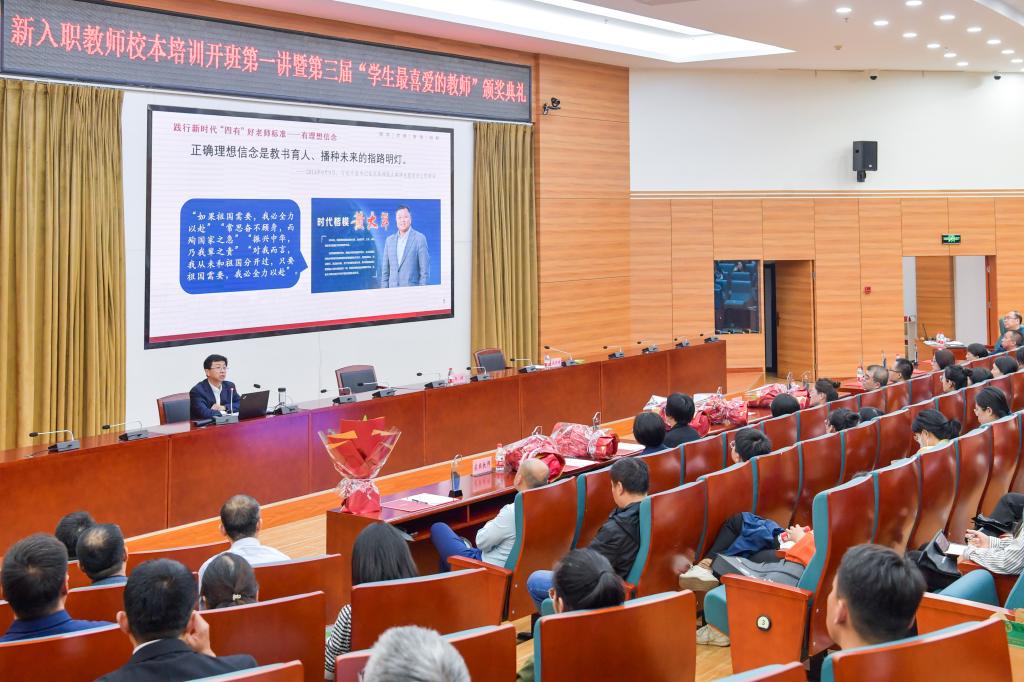 10月12日,我校舉行了2023年新入職教師校本培訓開班第一講暨第三屆“學生最喜愛的教師”頒獎典禮。黨委書記郭健出席會議為獲獎教師頒獎并作主題報告,黨委常委、副校長孟慶瑜主持。