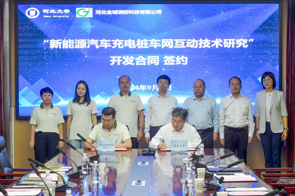 9月8日,河北大學與河北金城消防科技有限公司千萬級技術開發合同簽約儀式在七一路校區舉行。校黨委書記郭健,黨委常委、副校長單耀軍;河北金城總經理黃振卓,市場總監張高峰等出席儀式。