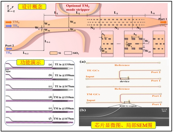 在偏振管理上,團隊設計并實驗演示了一種高性能、超寬帶片上偏振分束器。該器件利用了多模波導中超高的偏振模雙折射,通過精細模式調控的反向模式變換光柵實現了不同偏振態沿不同方向路由,再配合絕熱非對稱定向耦合器實現了超寬帶的模式耦合輸出。測試結果顯示,該器件消光比>30dB的工作帶寬超220nm,性能優于同類器件。相關成果發表在Optics Express (2025,33:7771), 碩士研究生張磊和高志遠為共同第一作者,吳勝保副教授為通訊作者。此外,團隊還針對經典布拉格光柵型起偏器的反射信號會干擾前置光路的難題,提出了一種寬帶的反射信號抑制技術,相關成果發表在Optics Letters(2024, 49:4995),吳勝保副教授為第一作者,姚曉天教授為論文通訊作者。