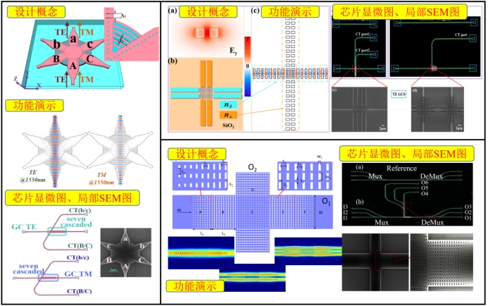 隨著以人工智能為代表的新一代變革性信息技術的涌現,以電子作為信息載體的微電子芯片正面臨日益突出的“電子瓶頸”問題,與現有標準CMOS集成電路工藝兼容的硅光芯片技術是目前最具潛力的解決方案。近期,物理學院光信息技術團隊吳勝保副教授聯合東南大學、南京理工大學、福州大學等單位研究人員,在構建大容量、高集成度硅光芯片中的關鍵功能單元,如模分復用、偏振管理、交叉連接等取得了系列進展。