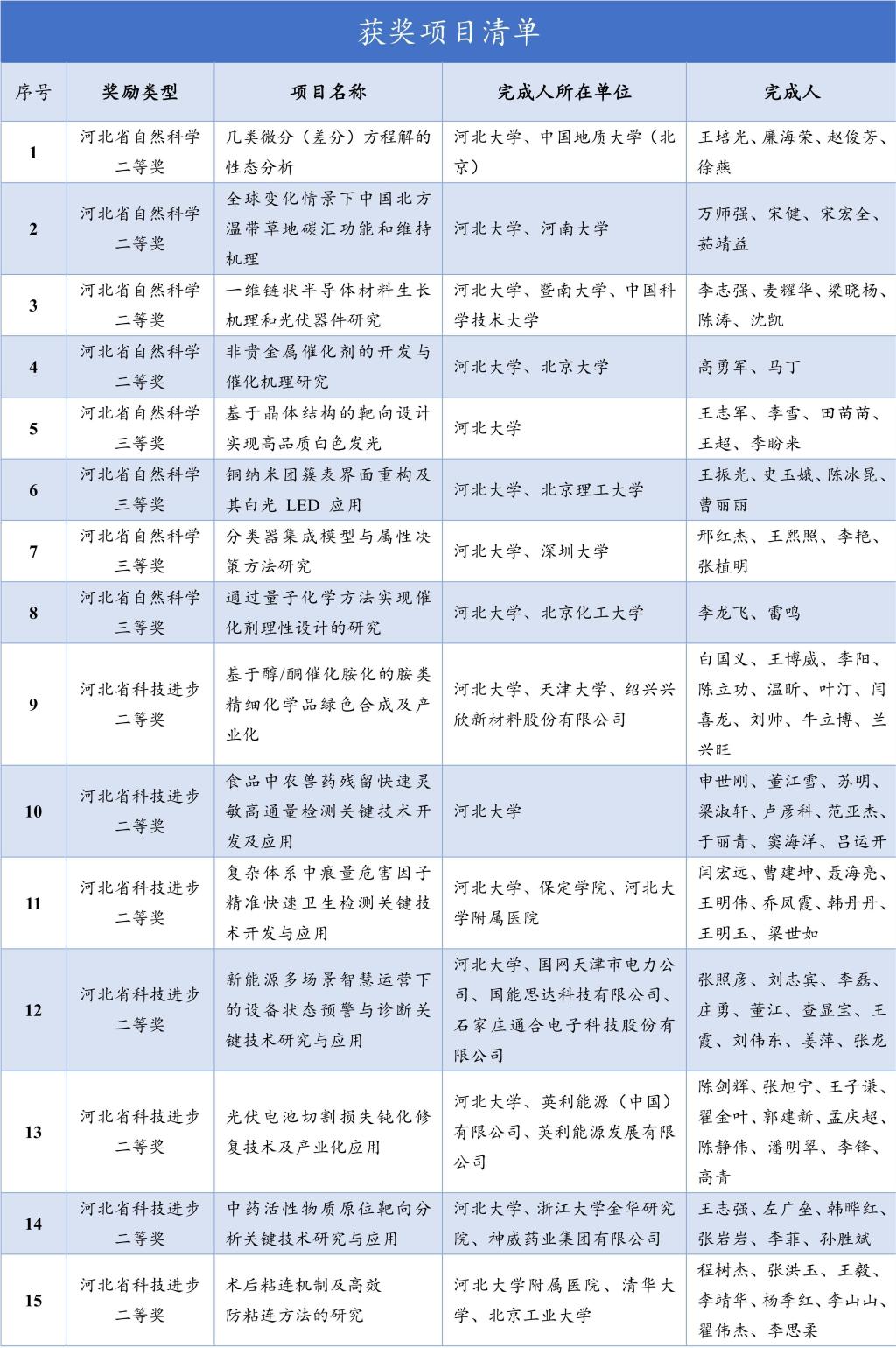 河北省科學技術獎由河北省人民政府設立,旨在表彰在河北省科學技術活動中做出突出貢獻的個人和組織。經過形式審查、網絡評審、行業評審和總評答辯等程序,最終共評出2023年度河北省科學技術獎253項(人/組織)。河北大學共獲2023年度河北省科學技術獎15項(詳見獲獎清單),其中二等獎首次突破10項;自然科學獎8項,占全省自然獎總數32%。