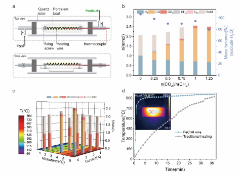 當前,在自然環境中難以降解的廢舊塑料和具有溫室效應的二氧化碳為人類社會帶來了嚴重的生態危機,資源化利用這兩種廢棄碳資源不但可以緩解和治理其帶來的環境問題,還可以節約寶貴的化石能源,實現“變廢為寶”。鑒于此,高勇軍教授課題組與北京大學馬丁教授團隊合作,通過合理設計,利用焦耳加熱技術實現了廢塑料和二氧化碳催化重整制備合成氣(氫氣和一氧化碳),可為重要石油化工過程——費托合成提供原料。該研究所用的核心組件為商品化的廉價鐵鉻鋁電阻絲,不但為反應提供熱能,而且為催化反應提供了活性中心,具有較高的催化性能及能源轉化效率。為了使該催化轉化過程更加綠色化,構建了太陽能光伏供電-焦耳熱催化轉化演示系統,可以在太陽光照下實現廢舊塑料和二氧化碳向合成氣的高效轉化。